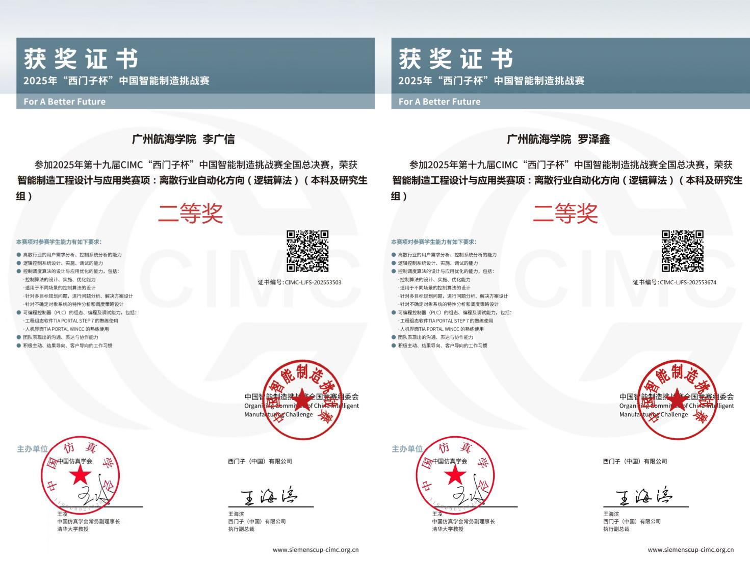 “西门子杯”中国智能制造挑战赛作为国内极具影响力的赛事,吸引了众多高校的积极参与。本届决赛共有来自浙江大学、同济大学、哈尔滨工业大学等384所高校、927支队伍、3000多名学生同台竞技,竞争异常激烈。全国总决赛所有赛项共评出特等奖90项,一等奖255项,二等奖458项。其中,智能制造工程设计与应用类——离散行业自动化方向(逻辑算法)赛项特等奖11项,一等奖31项,二等奖61项。学校低空装备与智能控制学院电气工程222班的罗泽鑫和李广信在指导老师曾新红的悉心指导下,凭借扎实的专业能力、出色的工程实践水平和稳定的临场发挥,在比赛中脱颖而出,成功荣获全国总决赛二等奖的好成绩,充分展现了广航院学子不畏强手、勇于拼搏的精神风貌和扎实的专业实力。